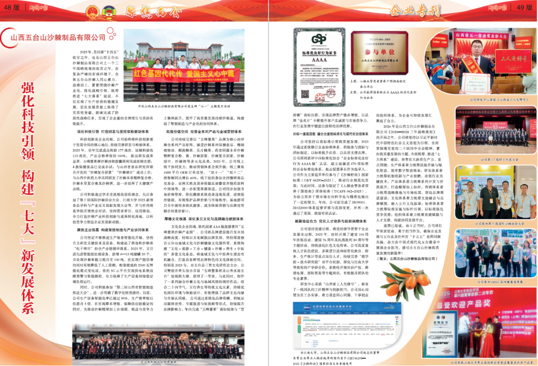 2025年,是国家“十四五”收官之年,也是山西五台山沙棘制品有限公司上一个三年战略规划的收官之年。在复杂严峻的宏观环境下,全体五台山沙棘人同心聚力、迎难而上,紧紧围绕沙棘产业化,强化战略引领,统筹推进“七大体系”建设,不仅实现了生产经营的稳健发展,更在发展质量上取得了实质性突破,圆满完成了阶段性战略任务,实现了企业量的合理增长与质的有效提升。