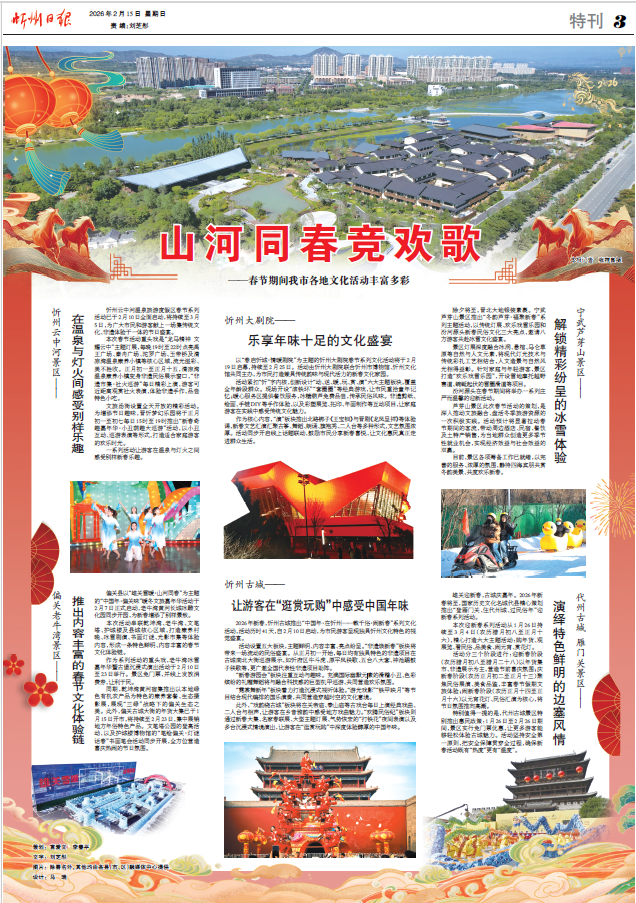 忻州古城——让游客在“逛赏玩购”中感受中国年味 2026年新春,忻州古城推出“中国年·在忻州——载千俗·闹新春”系列文化活动,活动历时41天,自2月10日启动,为市民游客呈现独具忻州文化特色的视觉盛宴。 活动设置五大板块,主题鲜明、内容丰富、亮点纷呈。“非遗焕新春”板块将带来一场流动的民俗盛宴。从正月初一开始,每日均有独具特色的非遗项目在古城南北大街巡游展示,如忻府区牛斗虎、原平凤秧歌、五台八大套、神池踢鼓子秧歌等,更广邀全国代表性非遗项目助阵。 “新春游园会”板块注重互动与趣味。充满国际幽默元素的滑稽小丑、色彩缤纷的礼帽舞蹈将与融合科技感的巨型机甲巡游,共同营造欢乐氛围。 “霓裳舞新年”板块着力打造沉浸式视听体验。“游光戏影”“铁甲映月”等节目结合现代编排的国乐演奏,共同营造穿越时空的文化意境。 此外,“戏韵绕古城”板块将在关帝庙、泰山庙等古戏台每日上演经典戏曲、二人台与相声,让游客在乡音雅韵中感受地方戏曲魅力。“欢腾民俗纪”板块则通过新春大集、名家春联展、大型主题灯展、气势恢宏的“打铁花”夜间表演以及多台沉浸式情境演出,让游客在“逛赏玩购”中深度体验醇厚的中国年味。