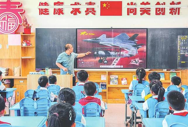 课堂上,吴静波用一幅幅珍贵的历史照片、一段段震撼的视频,将孩子们的思绪拉回新中国成立之初。他深情讲述着先辈们在条件艰苦、技术封锁的困境下,凭借顽强毅力与无尽智慧,一步步攻克难题,自主研制出初代战斗机并成功试飞的故事。随着讲解的深入,孩子们深入了解了我国战斗机从无到有、由弱变强的蜕变历程。