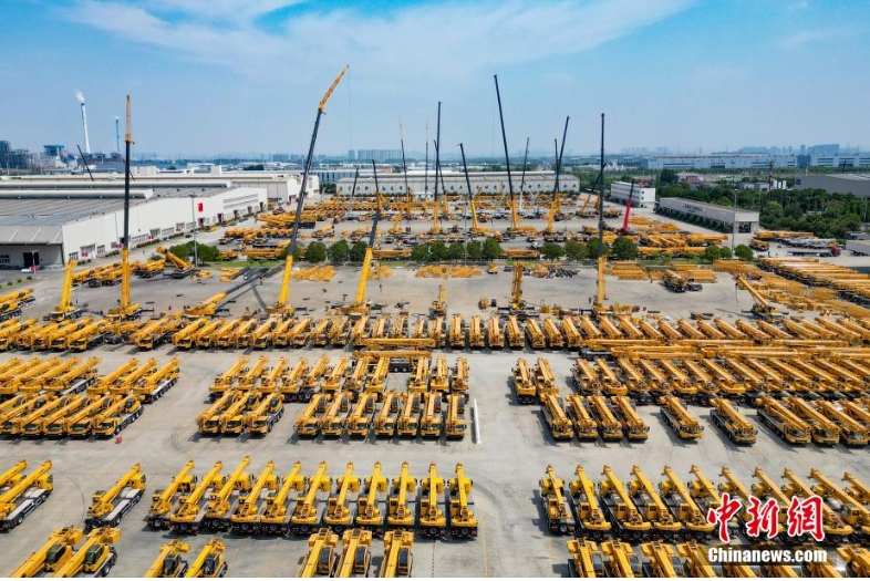 资料图:徐工集团生产车间外停放的起重机。(无人机照片)泱波 摄