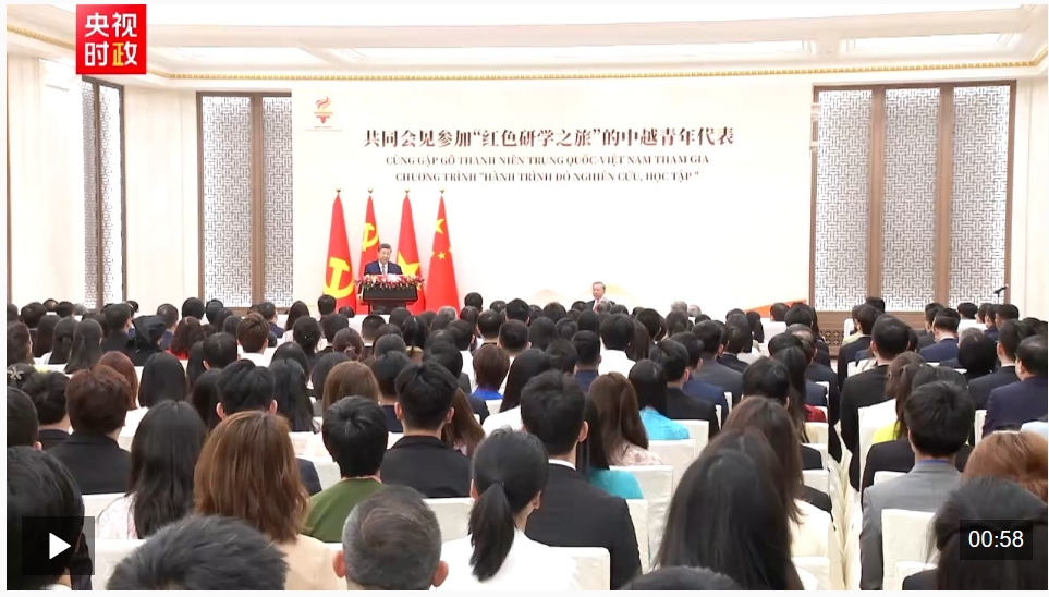 习近平表示,不久前,我收到越南河内国家大学外语附中等学校的同学们用中文写来的信,分享了参加“红色研学之旅”的深刻感悟,立志做中越友谊的传承者和传播者,我感到很欣慰。他强调,青年是推动社会发展进步的有生力量,也是中越两党两国事业薪火相传的接棒人,中越友好的未来在青年。