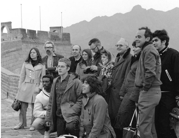 1971年4月12日,美国乒乓球代表团游览长城时合影。新华社记者 汤孟宗 摄