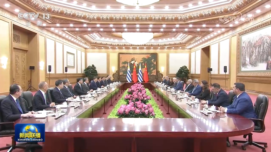 习近平指出,当今世界正处于百年未有之大变局,国际形势变乱交织,单边霸凌愈演愈烈,中方支持乌拉圭接任“77国集团和中国”轮值主席国,愿与乌方加强全球南方团结协作,共同推进平等有序的世界多极化、普惠包容的经济全球化,携手并进、共谋发展,为构建人类命运共同体作出更大贡献。中方始终重视中拉关系,支持拉美和加勒比国家维护自身主权、安全、发展利益,支持乌拉圭接任拉美和加勒比国家共同体以及南方共同市场轮值主席国,愿同乌方和地区国家推动共建中拉命运共同体走深走实。