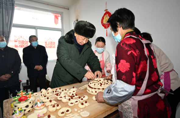 这是2022年1月26日下午,习近平总书记在临汾市霍州市师庄乡冯南垣村,同师红兵一家做年馍。新华社记者 李学仁 摄