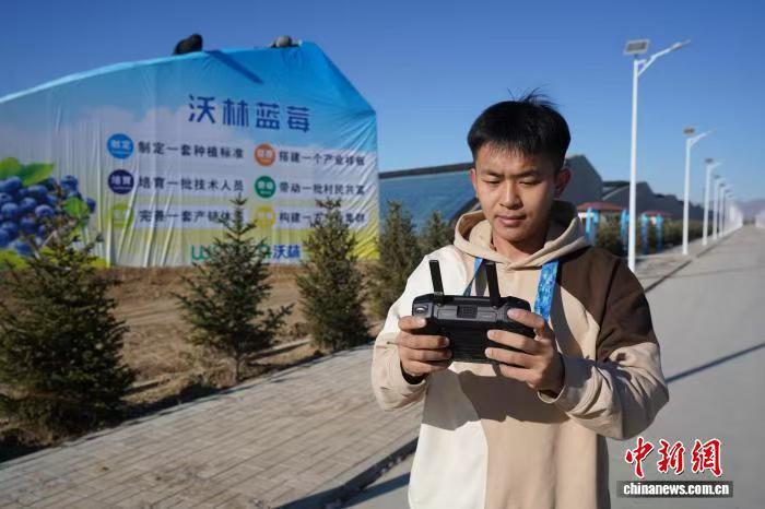 在阳高蓝莓种植基地,青年裴旸操控无人机拍摄素材,为短视频平台推广家乡蓝莓做准备。宋佳烨 摄