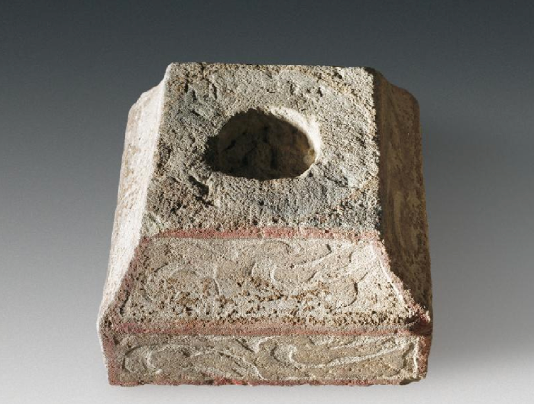 本次征集的四块画像石,材质均为当地的红褐色砂质页岩,采用浅剔地平铲的雕刻技法,只刻出物象的外部轮廓,内部细节不用阴线刻划,而多以墨线勾绘,部分位置施黑彩。其中4号画像石石柱,高116厘米,横断面呈六边形,边长9.2厘米。正面阴刻汉隶“熹平元年十二月四日离石寿贵里韩元重造作千万卋(世)之舍”,其余五面刻绘卷云纹。石柱顶端凸起一圆形榫头,以榫卯形式与上方的方形栌斗石相接。栌斗石高16厘米,八面均刻绘卷云纹,每面以朱彩描绘边界。