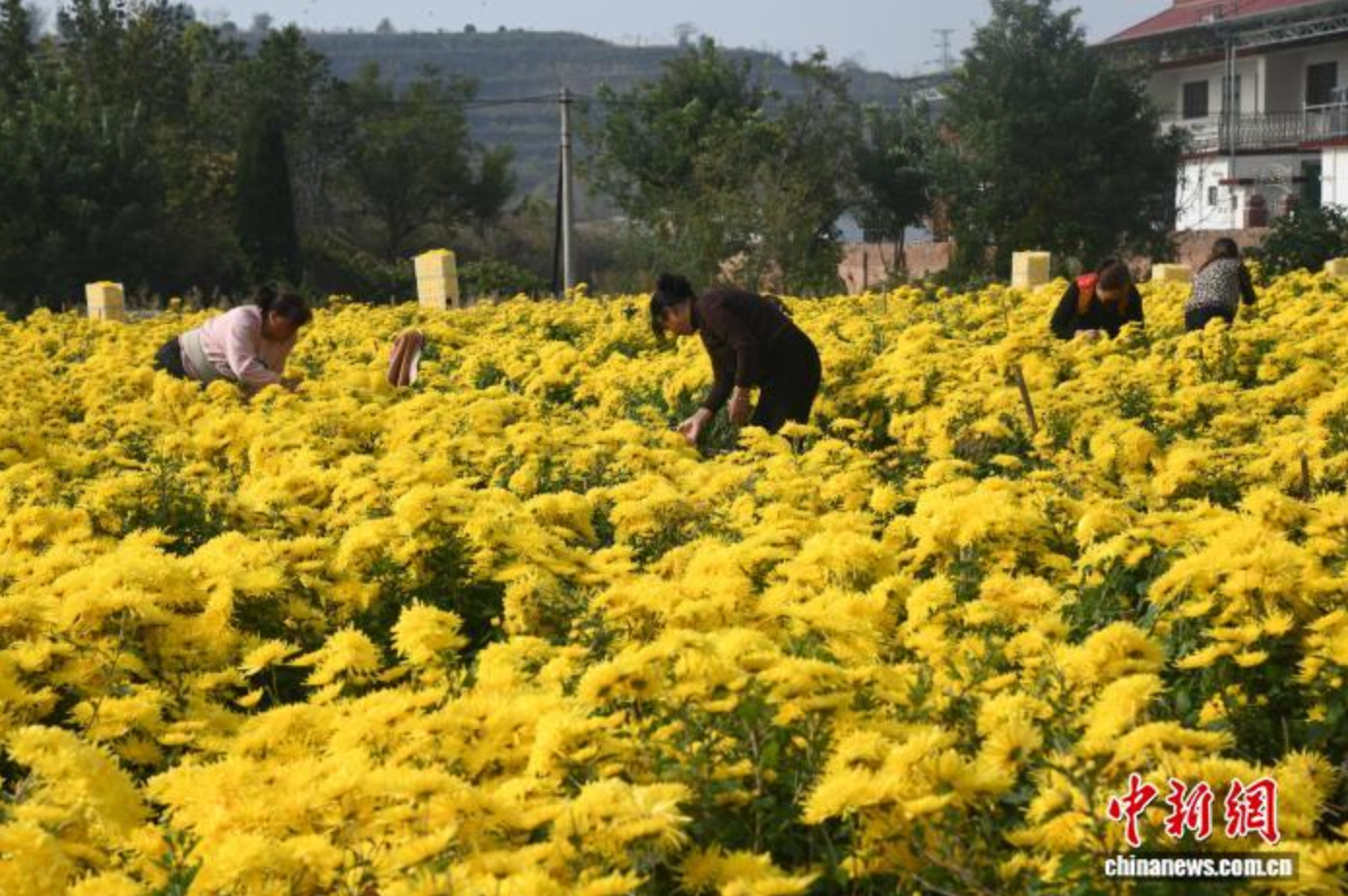 中新网运城11月6日电 (李庭耀 杨一敏)金秋时节,山西省运城市闻喜县桐城镇下白土村的金丝皇菊种植基地中,连片菊花随风摇曳,缕缕菊香扑面而来。村民们趁着晴好天气穿梭其间,指尖轻捻间将饱满的菊瓣收入筐中,脸上洋溢着丰收的喜悦。