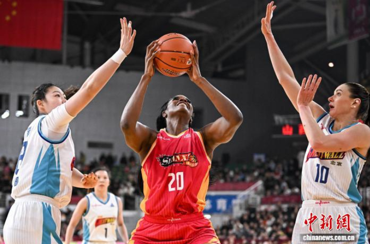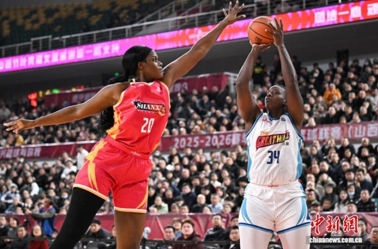 1月23日,北京队球员詹姆斯(白衣)在比赛中投篮。当日,在太原举行的2025-2026赛季中国女子篮球联赛(WCBA)常规赛第19轮比赛中,山西竹叶青酒队主场以82比68战胜北京首钢园队。中新社记者 韦亮 摄
