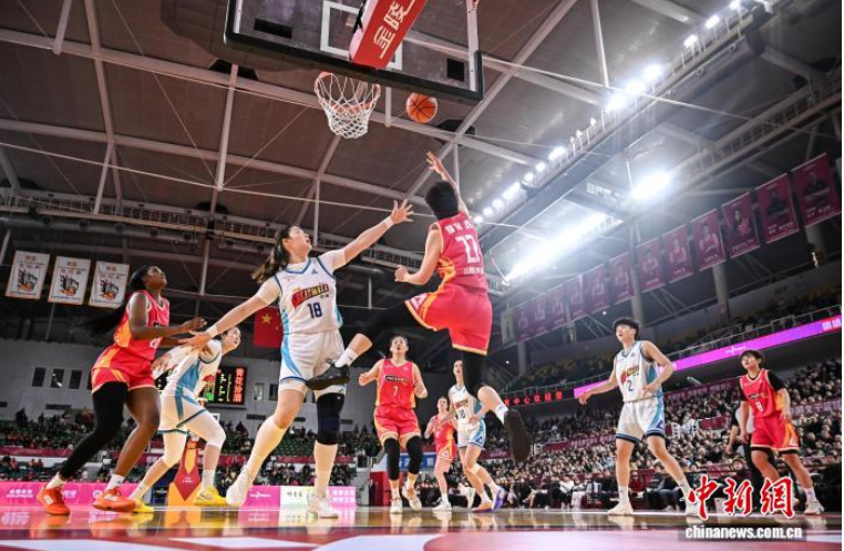 1月23日,山西队球员林育庭(红衣)在比赛中上篮。当日,在太原举行的2025-2026赛季中国女子篮球联赛(WCBA)常规赛第19轮比赛中,山西竹叶青酒队主场以82比68战胜北京首钢园队。中新社记者 韦亮 摄