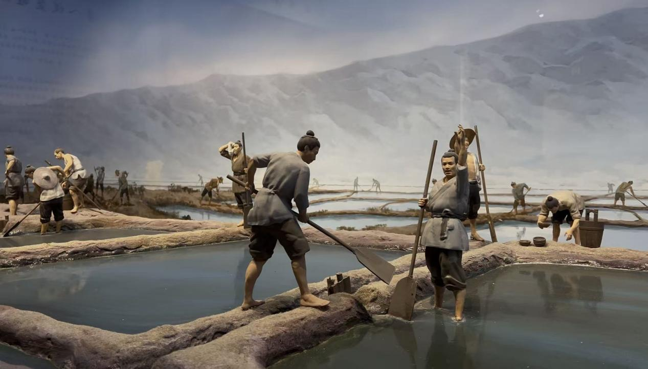 河东池盐博物馆内的雕塑再现池盐生产过程。(杨旸/摄)