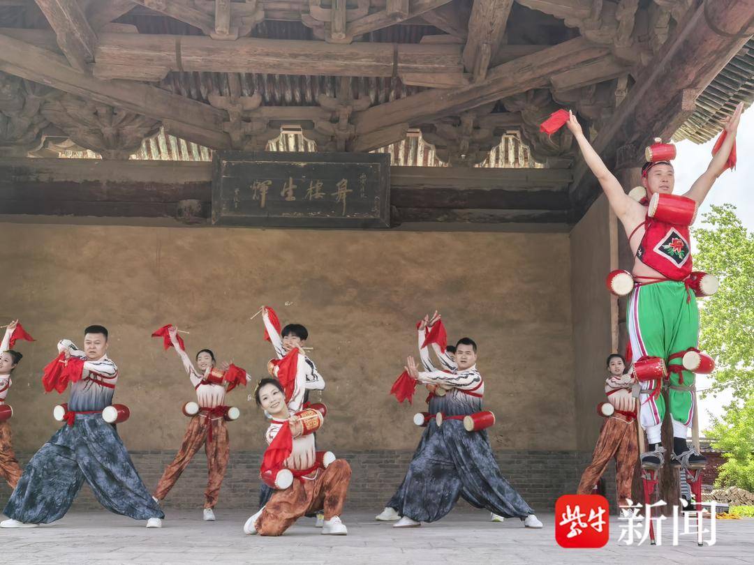 当地演员在戏台上表演了翼城花鼓和浑身板,它们都是国家级非物质文化遗产。