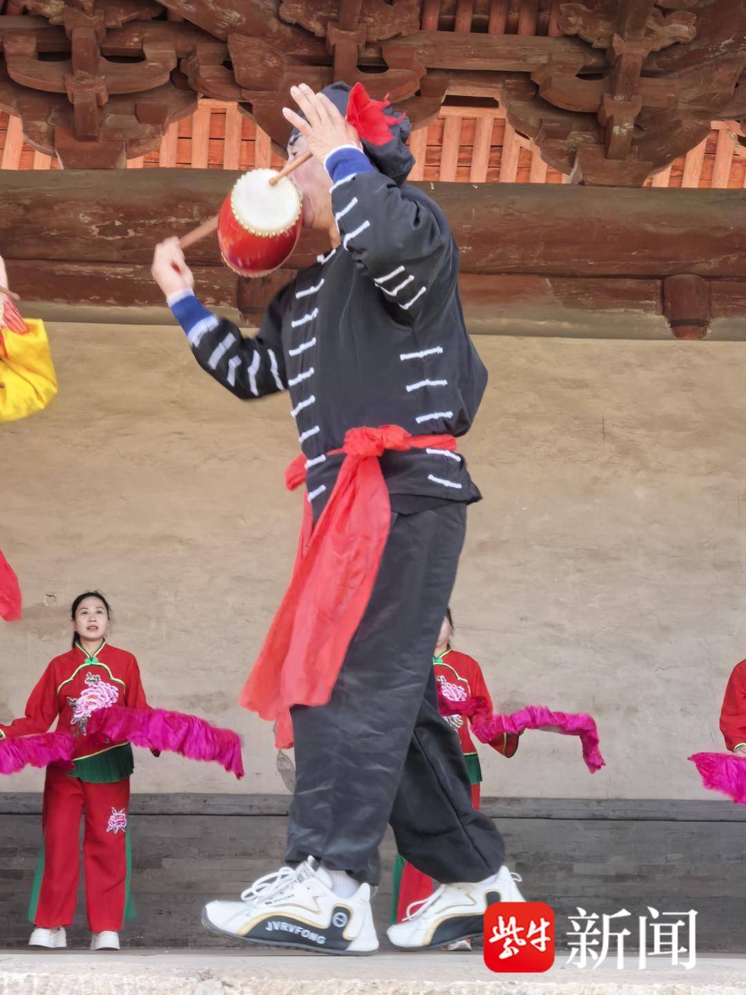 当地村民在舞楼上演出了传统舞蹈翼城丑花鼓。翼城丑花鼓已有300余年历史,以“口噙花鼓”“击鼓而舞”“丑角主演”为特色,融合武术、杂技动作,风格诙谐热烈。据非遗丑花鼓表演者何军说,每逢重大节日,他们都会在舞楼上表演丑花鼓,村民们都来看,十分热闹。
