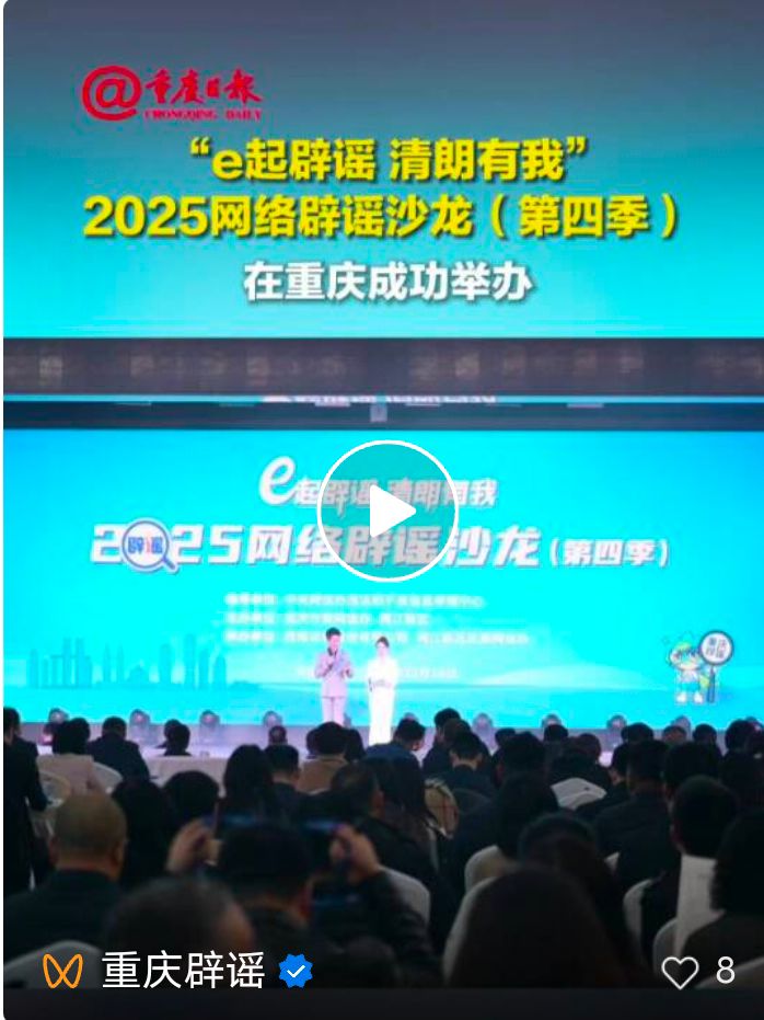 活动现场发布了《2025重庆网络辟谣年度十大案例》《重庆网络谣言治理研究报告(2025)》,以及重庆市“首批涉企网络举报辟谣工作直联点”试点单位。