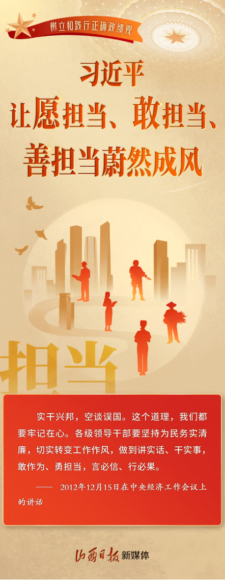山西日报 “好好学习” 专栏今起推出 “学习卡片 · 树立和践行正确政绩观”系列动图海报,生动展示习近平《让愿担当、敢担当、善担当蔚然成风》重要文章精髓要义,推动理论学习入脑入心、见行见效,激励广大党员干部以时时放心不下的责任感、积极担当作为的精气神,不断开创中国式现代化山西实践新局面。