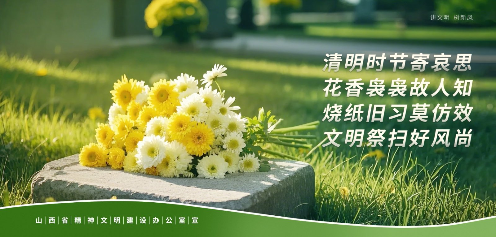 清明时节寄哀思,花香袅袅故人知。烧纸旧习莫仿效,文明祭扫好风尚