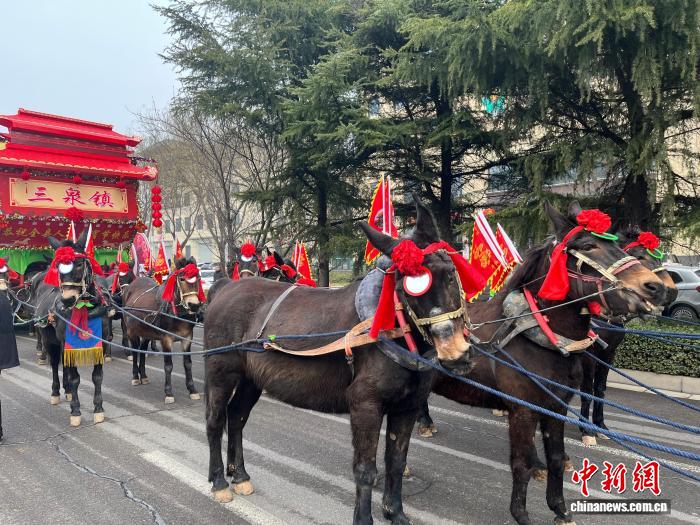 3月3日,农历正月十五元宵节,参与山西省运城市新绛县的民间社火马拉鼓车表演的骡马整装待发。 中新社记者 范丽芳 摄