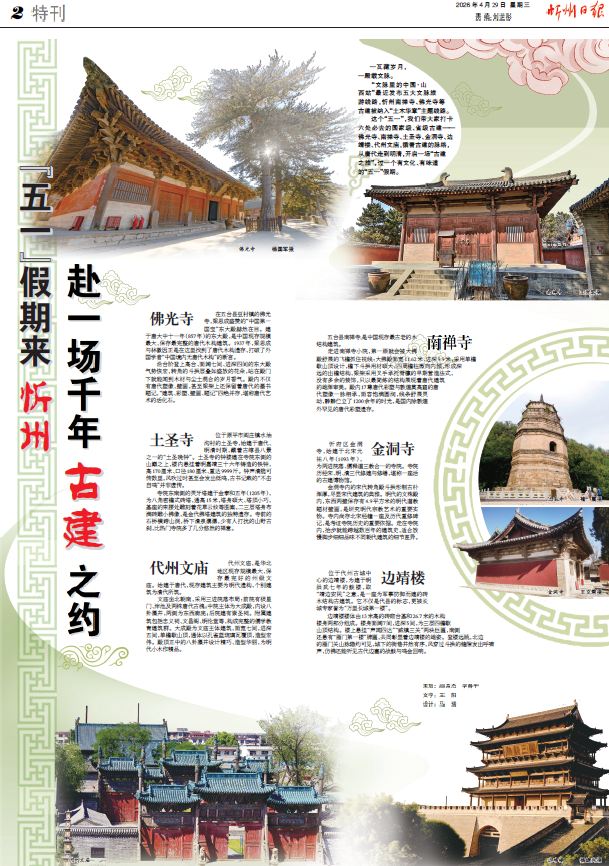 这个“五一”,我们带大家打卡六处必去的国家级、省级古建——佛光寺、南禅寺、土圣寺、金洞寺、边靖楼、代州文庙,循着古建的脉络,从唐代走到明清,开启一场“古建之旅”,过一个有文化、有味道的“五一”假期。