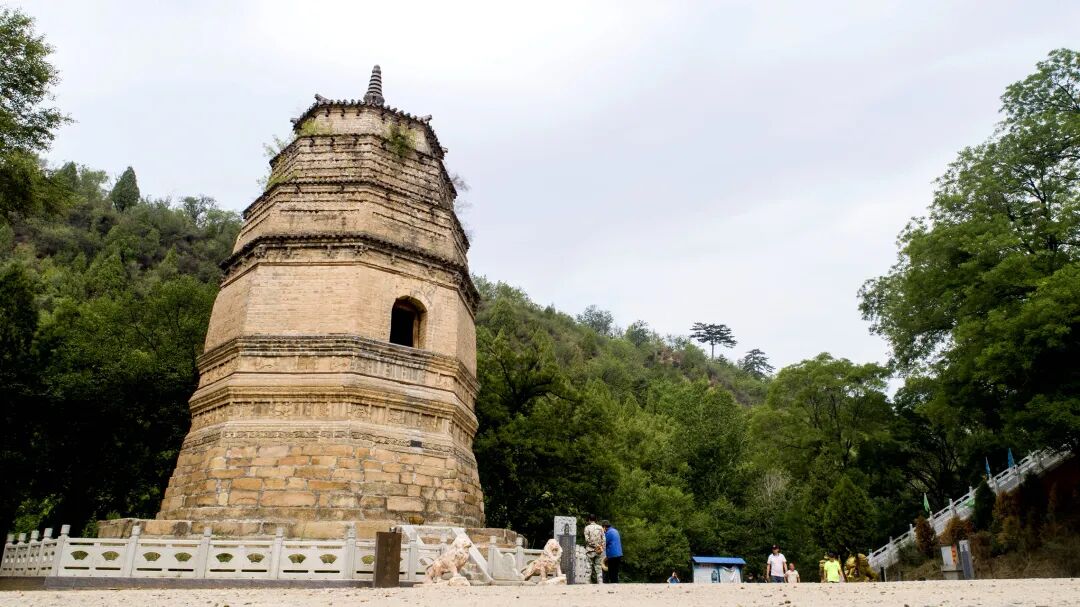 寺院东南侧的灵牙塔建于金泰和五年(1205年),为八角密檐式砖塔,通高15米,塔身硕大、塔顶小巧,基座的束腰处雕刻着花草云纹等图案,二三层塔身布满砖雕小佛像,是金代佛塔建筑的独特遗存。寺前的石桥横跨山涧,桥下清泉潺潺,少有人打扰的山野古刹,比热门寺院多了几分悠然的禅意。