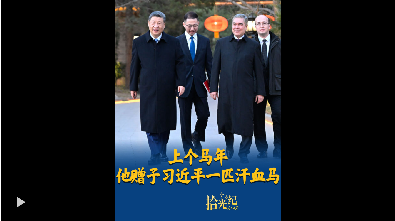 3月18日,国家主席习近平会见土库曼斯坦民族领袖、人民委员会主席别尔德穆哈梅多夫。2014年,别尔德穆哈梅多夫曾赠予中方一匹汗血马。“推动中土关系像汗血宝马一样马不停蹄、一马当先”,一起回顾中土的“骏马外交”。