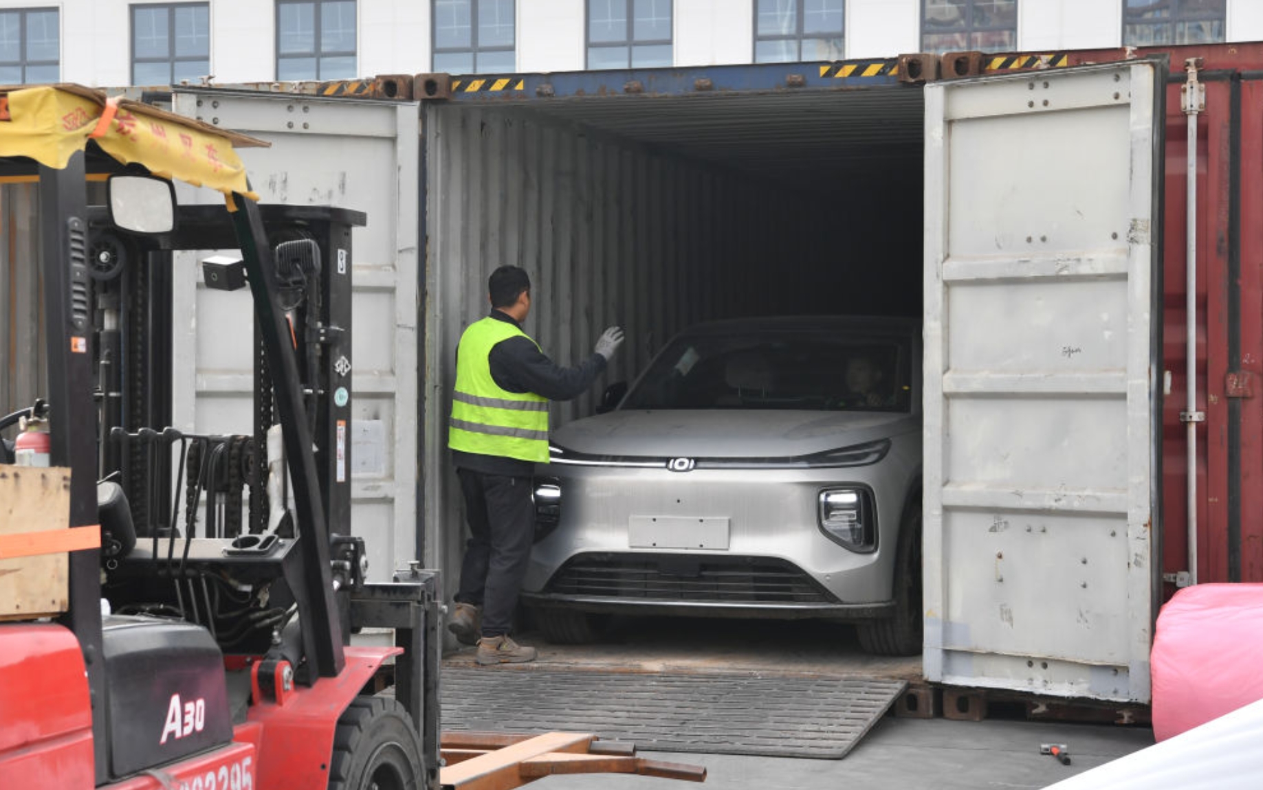 2025年11月14日,在西安国际港站哈萨克斯坦西安码头,工人将新能源汽车驶入集装箱内。新华社记者 邵瑞 摄