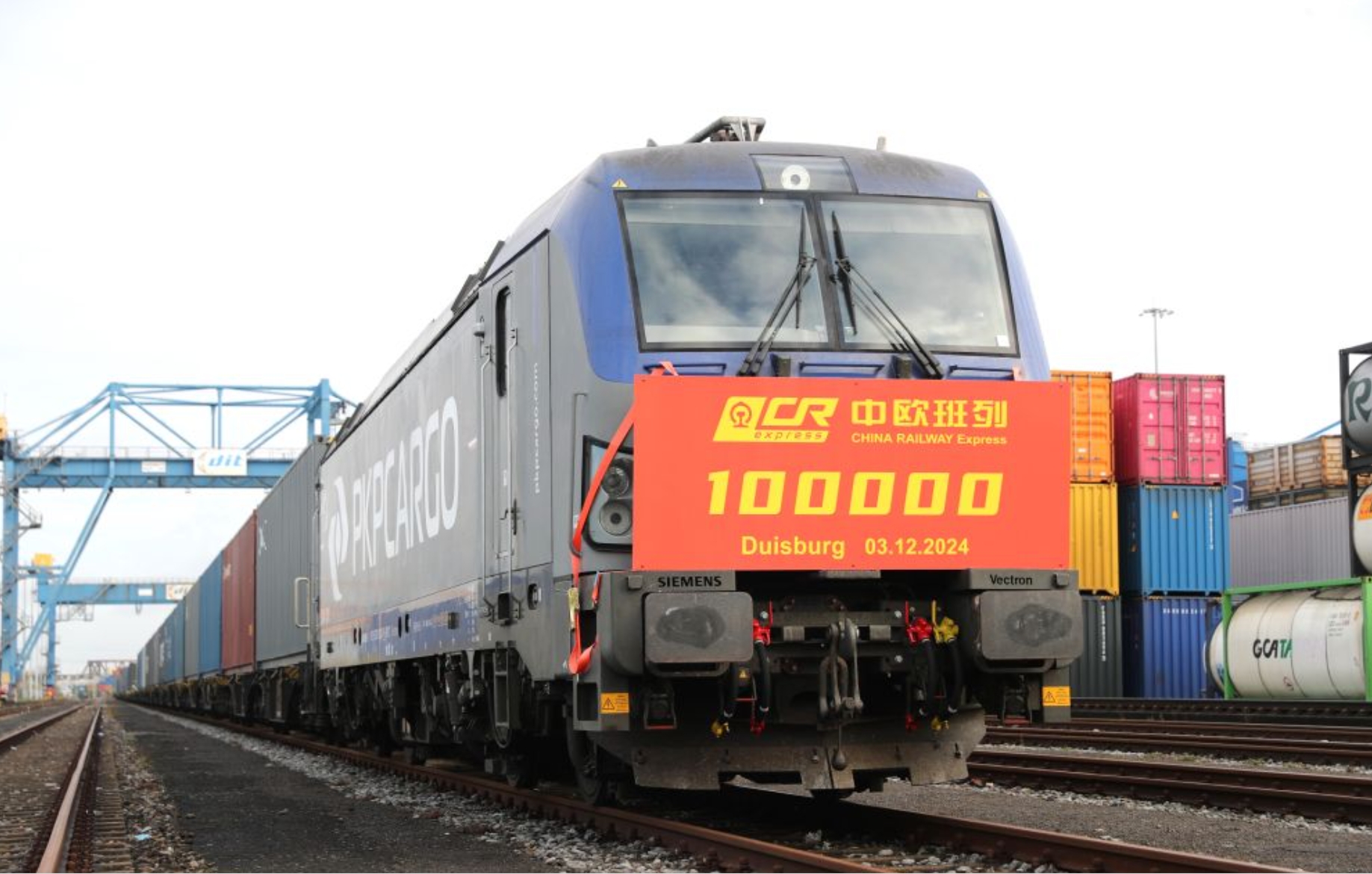 这是2024年12月3日在德国杜伊斯堡市DIT场站拍摄的第10万列中欧班列。新华社记者 杜哲宇 摄