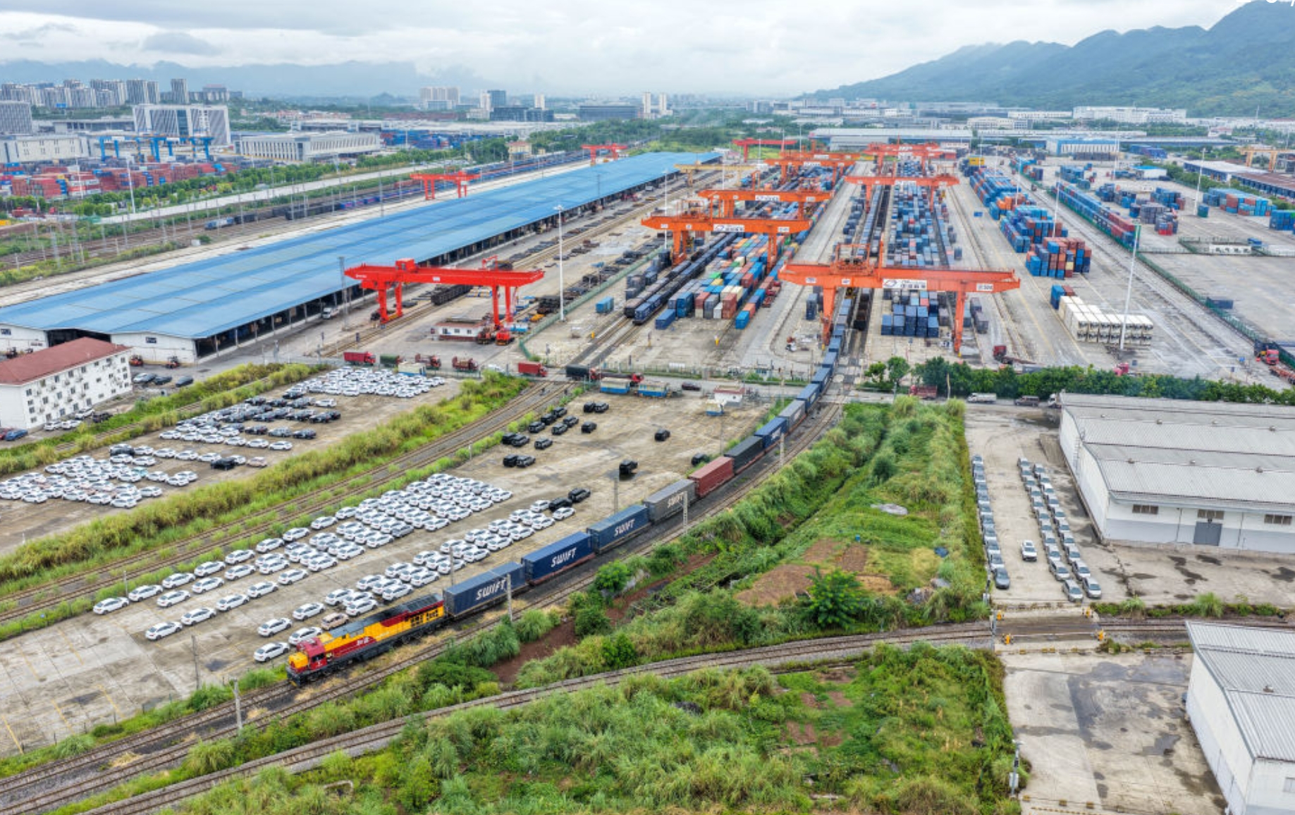 2025年9月8日,满载“重庆造”汽车的中欧班列(成渝)在重庆团结村中心站顺利发车(无人机照片)。新华社记者 唐奕 摄