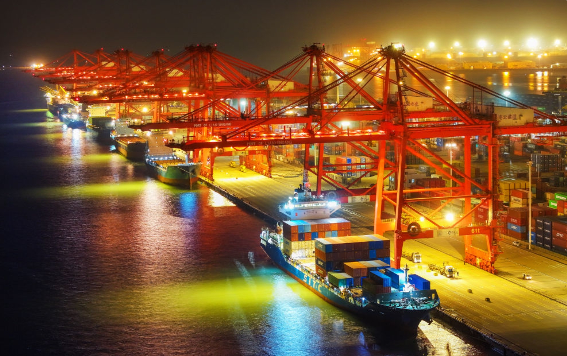 2024年12月14日晚拍摄的江苏省连云港港集装箱码头(无人机照片)。新华社发(王健民摄)