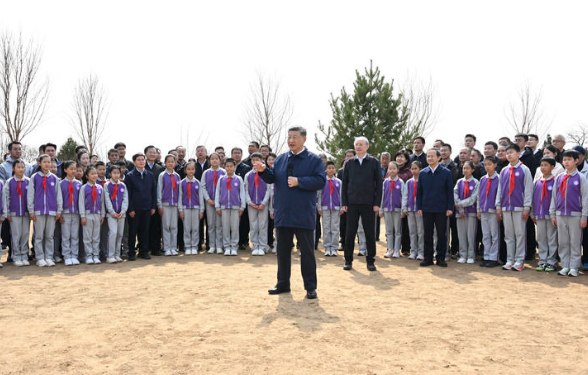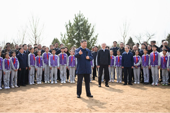 3月30日,党和国家领导人习近平、李强、赵乐际、王沪宁、蔡奇、丁薛祥、李希等来到北京市昌平区百善镇参加首都义务植树活动。这是习近平同在场的干部群众、少先队员亲切交谈。新华社记者 燕雁 摄