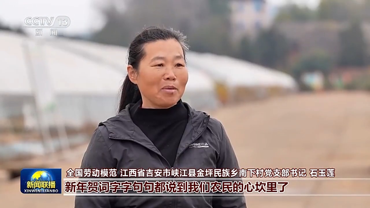 全国劳动模范 江西省吉安市峡江县金坪民族乡南下村党支部书记 石玉莲:新年贺词字字句句都说到我们农民的心坎里了。新的一年,我们推动农业提质增效,种出更高品质的粮食,还要培育更多新农人,让咱们农村更美、农业更强、农民更富,用丰收的答卷回报总书记的牵挂与嘱托。
