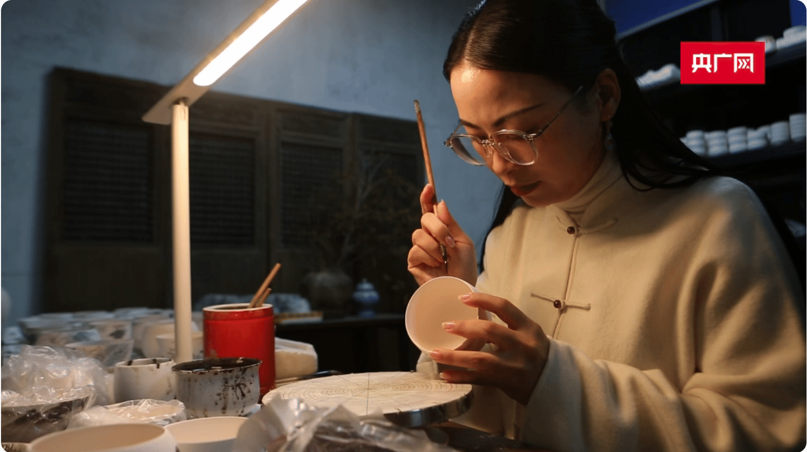 景德镇青花人物制作技艺非遗传承人吴帆在瓷坯上描绘纹饰(央广网记者 周蓓 制作)