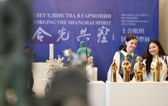 2025年7月23日,2025上合组织国家文明对话在天津举行,参会者在“合光共塑”上合组织国家雕塑展上参观。新华社记者 李然 摄