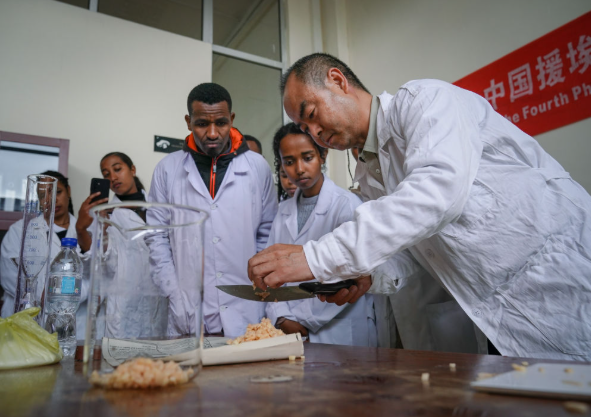 2025年8月20日,在埃塞俄比亚首都亚的斯亚贝巴,中方专家在亚的斯亚贝巴理工学院对大学生进行菌种制作技术指导。新华社记者 韩旭 摄