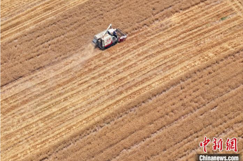 资料图:江苏南京,工作人员驾驶农机在江北一处田间收割小麦。(无人机照片)中新社记者 泱波 摄