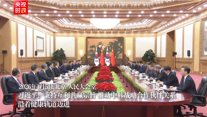 1月5日下午,国家主席习近平在北京人民大会堂同来华进行国事访问的韩国总统李在明举行会谈。