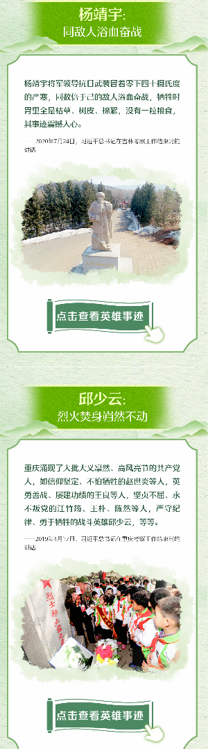 “天地英雄气,千秋尚凛然。”习近平总书记指出,对一切为国家、为民族、为和平付出宝贵生命的人们,不管时代怎样变化,我们都要永远铭记他们的牺牲和奉献。清明节,让我们重温习近平总书记缅怀革命先烈以及和平年代英雄们的深情话语,一起学习英烈事迹,赓续精神血脉,凝聚前行力量。