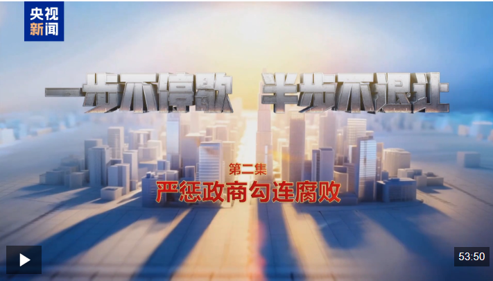 由中央纪委国家监委宣传部与中央广播电视总台央视联合摄制的电视专题片《一步不停歇 半步不退让》,1月12日在总台央视综合频道晚8点档播出第二集《严惩政商勾连腐败》,央视新闻新媒体平台同步播发。