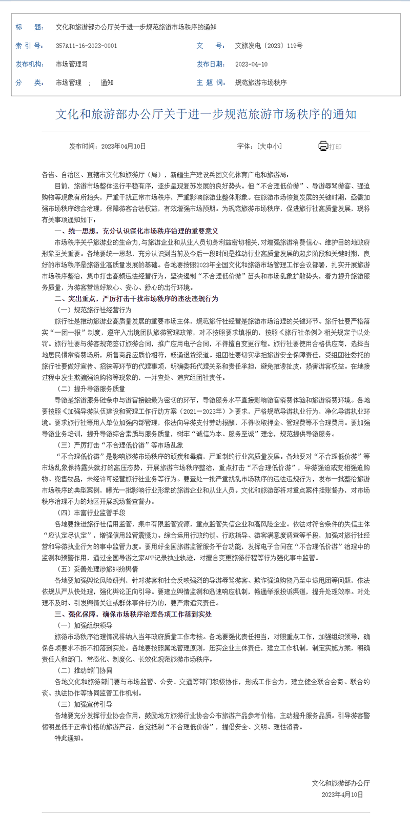 市场秩序关乎旅游业的生命力,与旅游企业和从业人员切身利益密切相关,对增强旅游消费信心、维护目的地政府形象至关重要。各地要统一思想,充分认识到当前及今后一段时间是推动行业高质量发展的起步阶段和关键时期,良好的市场秩序是旅游业高质量发展的基础。各地要按照2023年全国文化和旅游市场管理工作会议部署,扎实开展旅游市场秩序整治,集中打击高频违法经营行为,坚决遏制“不合理低价游”苗头和市场乱象扩散势头,着力提升旅游服务质量,为游客营造好放心、安心、舒心的出行环境。