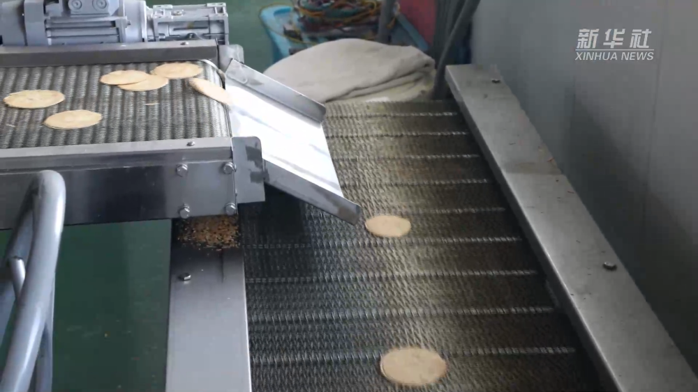 在山西省晋中市昔阳县大寨镇洪水村的压饼产业园内,全自动生产线正在生产金黄酥脆的压饼。压饼是昔阳特色食品,2018年成功申报为国家级地理标志产品。